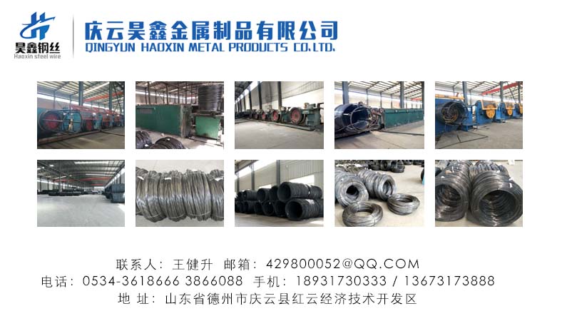 慶云昊鑫金屬制品有限公司坐落在山東省德州市慶云縣紅云經濟技術開發區,這里環境優美、交通便利,本廠主要加工生產45#-70#、65Mn彈簧鋼絲、77B-82B預應力鋼絲、30MnSi篩網鋼絲、Q195、Q235低碳冷撥絲等產品。